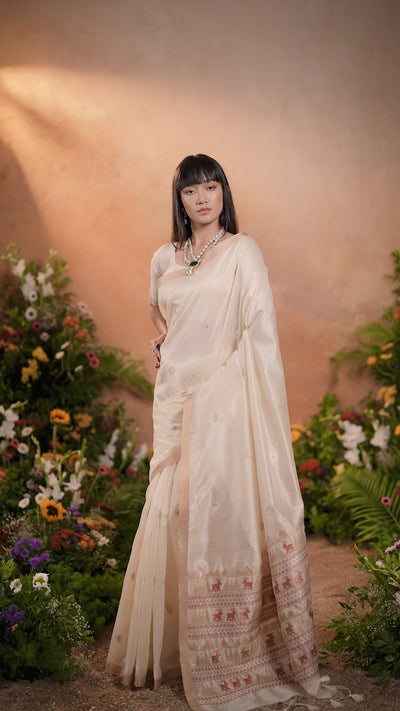 Pearl White Tussar Handloom Silk Saree