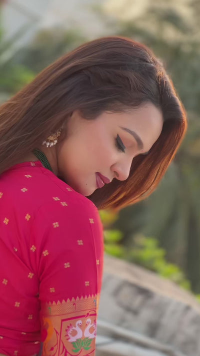 Embrace the grandeur of tradition with this Copper Orange Zari Woven Paithani Saree, a masterpiece that beautifully blends heritage with artistry. The saree features intricate weaving, while the pallu is adorned with elegant peacock designs, symbolizing grace and prosperity. Perfect for weddings, festive occasions, and cultural celebrations, this Paithani drapes you in timeless charm.