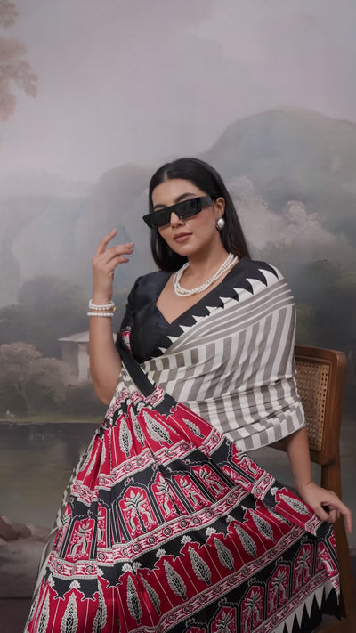 Elevate your ethnic wardrobe with this stunning Cornsilk White and Black Ajrakh Printed Satin Crepe Silk Saree, beautifully crafted to combine tradition with contemporary elegance. The saree features a unique striped design that adds a modern edge to the classic Ajrakh motifs. Its highlight is the intricately crafted temple border, which enhances the saree’s traditional charm and creates a striking visual appeal.