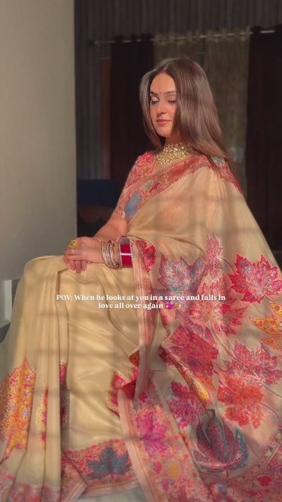 Experience the timeless elegance of Kashmir with this exquisite Daisy White Kashmiri Handloom Jamewar Saree, crafted from a luxurious Pashmina cotton fabric. Known for its exceptional softness, warmth, and breathability, the pashmina cotton blend ensures a graceful drape and all-day comfort. Adorned with intricate traditional Jamewar motifs inspired by Kashmiri heritage, this saree reflects fine craftsmanship and rich cultural artistry. Perfect for festive occasions and weddings.