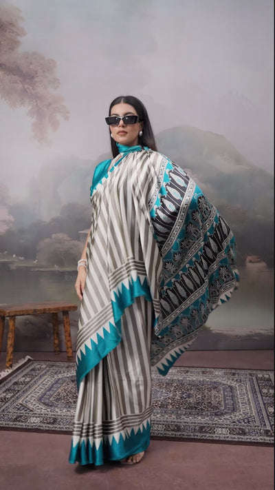 Snow White and Blue Ajrakh Printed Satin Crepe Silk Saree