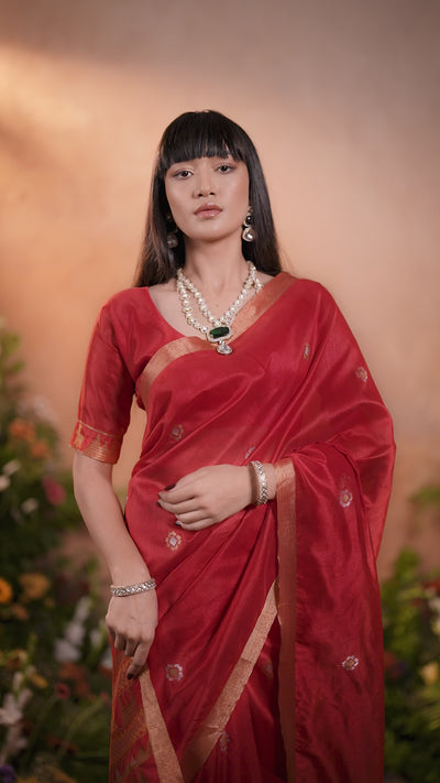 Celebrate artisanal beauty with this exquisite Spine Red Tussar Handloom Silk Saree, crafted from rich, textured tussar silk that offers a natural sheen and graceful drape. The highlight of this saree is its stunning Pichwai-inspired pallu, adorned with intricate deer motifs that reflect traditional Indian art and cultural storytelling. Perfect for festive occasions, temple visits, and elegant celebrations.