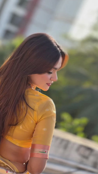 Grace meets heritage in this exquisite Sunflower Yellow Organza Woven Paithani Saree. Crafted from sheer and lightweight organza fabric, this saree features intricate traditional Paithani weaving that reflects rich Maharashtrian craftsmanship. The delicate zari-woven motifs and beautifully detailed border add a regal charm, while the crisp texture of organza creates a graceful, flowy drape. Perfect for weddings, festive celebrations, and special occasions.